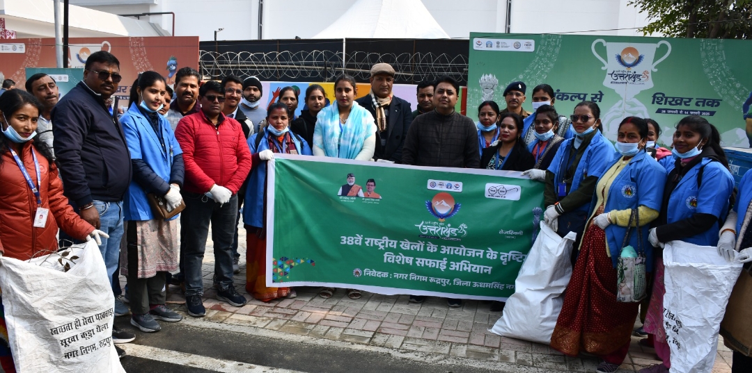 रूद्रपुर । 38वें राष्ट्रीय खेल के शुभ अवसर पर जिलाधिकारी नितिन सिंह भदौरिया के नेतृत्व में मंगलवार को मनोज सरकार स्पोर्टस स्टेडियम से रेलवे स्टेशन तक पूरे शहर में वृह्द सफाई अभियान चलाया गया। सफाई अभियान नगर निगम के पर्यावरण मित्रो, नारी शक्ति सेना, पुलिस, स्वयं सेवी संस्थाओं व अधिकारियो/कर्मचारियों द्वारा चलाया गया। पूरे शहर की सफाई हेतु 400 पर्यावरण मित्रों की 10 टीमें मय कूड़ा उठान वाहनो, जटायू, जेसीबी, पानी छिड़काव टैकर आदि लगाये गये है। स्पोर्टस स्टेडियम से जिलाधिकारी ने सफाई अभियान को हरी झंडी दिखाकर रवाना किया व स्वयं भी सफाई की।