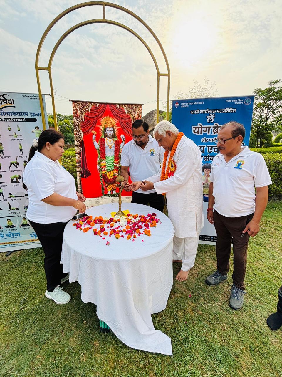 रुद्रपुर: जिला आयुर्वेदिक एवं यूनानी अधिकारी उधम सिंह नगर डॉ आलोक कुमार शुक्ला के निर्देशन में लेक पैराडाइस रुद्रपुर में हरित योग का भव्य आयोजन किया गया । कार्यक्रम में 125 साधकों के साथ कॉमन योगा प्रोटोकॉल का अभ्यास किया गया एवं मानव श्रृंखला का गठन कर लोगो को योग के विषय मे जागरूक किया गया। कार्यक्रम के माध्यम से योग को प्रकृति के साथ जोड़ने का अनुपम प्रयास किया गया।