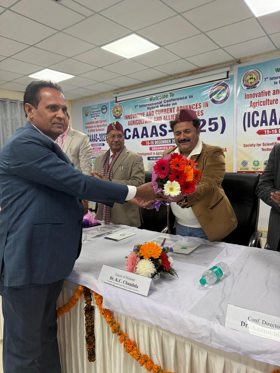 रूद्रपुर। चंदोला होम्योपैथिक मेडिकल कॉलेज के एमडी एवं उत्तराखण्ड आयुष परिषद के प्रदेश अध्यक्ष डॉ. केसी चंदौला को आयुष के क्षेत्र में उनके उल्लेखनीय योगदान के लिए हल्द्वानी में आयोजित अंतर्राष्ट्रीय सम्मेलन में सम्मानित किया गया। उत्तराखण्ड मुक्त विश्वविद्यालय के सभागार में आयोजित 7वें कृषि और सम्बद्ध विज्ञान में नवाचार और वर्तमान प्रगति सम्मेलन में देश और विदेश से करीब 500 शोधकर्ता, वैज्ञानिक और शिक्षाविद शामिल हुए। दो दिवसीय सम्मेलन का आयोजन आस्था फाउंडेशन, मेरठ और उत्तराखण्ड मुक्त विश्वविद्यालय के संयुक्त तत्वाधान में किया गया। सम्मेलन के मुख्य विषयों में कृषि विकास, पशु चिकित्सा, होम्योपैथिक चिकित्सा और जैव प्रौद्योगिकी की नवीन विधियों पर व्यापक चर्चा की गई। सम्मेलन के दौरान होम्योपैथिक चिकित्सा की पशुओं के उपचार में भूमिका, कीटनाशकों के पर्यावरण अनुकूल विकल्प के रूप में उपयोग और कृषि उत्पादन में इसका योगदान विषय पर भी मंथन किया गया। सम्मेलन के दौरान नवीन कृषि तकनीक, पशु चिकित्सा में होम्योपैथिक उपचार, जैव प्रौद्योगिकी के नवाचार और अनुसंधान को व्यावहारिक रूप में लागू करने के तरीके पर व्यापक चर्चा हुई। इस दौरान उपस्थित विशेषज्ञों ने डॉ. केसी चंदौला के योगदान की सराहना करते हुए उन्हें सम्मानित किया। सम्मान स्वरूप उन्हें टोपी पहनाई गई, शॉल ओढ़ाई गई और स्मृति चिन्ह भेंट किया गया। सम्मेलन में डॉ. केसी चंदौला ने आयुष, होम्योपैथी, आयुर्वेद और जैव प्रौद्योगिकी के क्षेत्र में अपनी उपलब्धियों और उनके उपयोगिताओं पर विस्तृत प्रकाश डाला। उन्होंने कहा कि इस तरह के सम्मेलन ज्ञान, नवाचार और अनुसंधान को साझा करने का बेहतरीन माध्यम हैं और यह आयुष क्षेत्र में नई दिशा प्रदान करते हैं। सम्मेलन में उत्तराखण्ड मुक्त विश्वविद्यालय के कुलपति प्रो. नवीन चन्द्र लोहनी, उत्तराखण्ड काउंसिल ऑफ बायोटेक्नॉलॉजी हल्द्वानी पंतनगर के निदेशक डॉ. संजय शर्मा, प्रो. आनंद सिंह जीना, डॉ. एसपी सिंह, डज्ञ. एसएस कुंजवाल, प्रो. महेन्द्र सिंह सहित कई प्रमुख वैज्ञानिक और शिक्षाविद उपस्थित रहे।