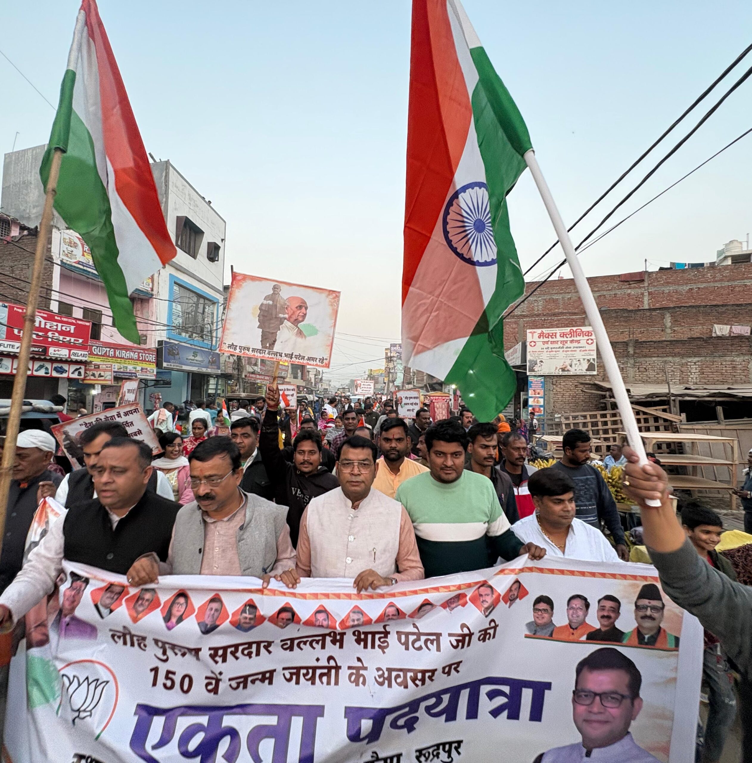 रुद्रपुर: लौह पुरुष भारत रत्न सरदार वल्लभ भाई भाई पटेल की 150वीं जन्म जयंती के अवसर पर रुद्रपुर ट्रांजिष्ट कैम्प में फुटबाल मैदान से विधायक शिव अरोरा के नेतृत्व ने भाजपा कार्यकताओ ने एकता पदयात्रा का आयोजन हुआ, जिसमे बड़ी संख्या ने लोगो ने प्रतिभाग किया ओर हाथों में तिरंगा लहराते हुऐ पैदल ट्रांजिष्ट कैम्प बाजार होते हुऐ सरदार वल्लभभाई पटेल के नारे लगाते पैदल यात्रा के माध्यम से निकले तो वही यात्रा का समापन झील पर हुआ।