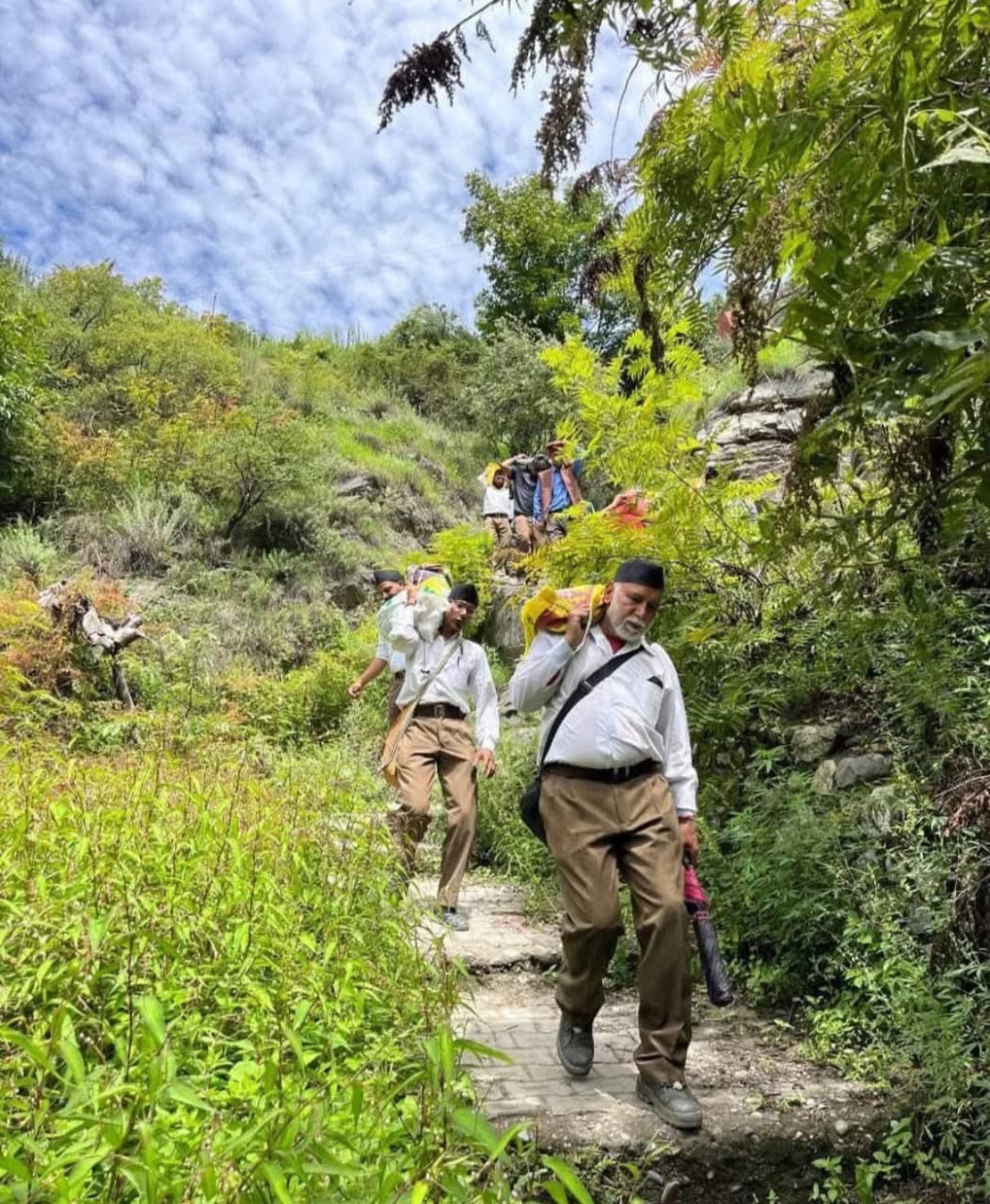 पहाड़ के सुदूर गांवों में स्वयंसेवकों और पूर्व सैनिकों की मदद से पगडंडियों के रास्ते स्वयंसेवक आपदाग्रस्त क्षेत्रों में पहुंच कर राशन किट पहुंचा रहे है।